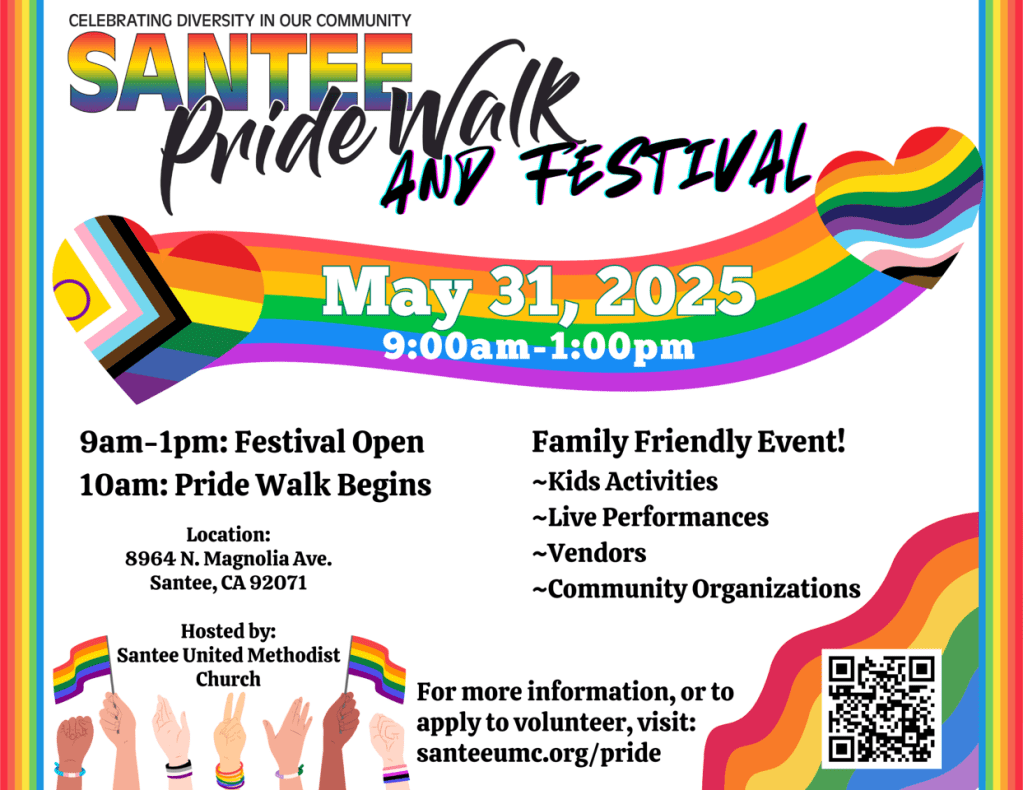Join us for the Santee Pride Walk & Festival on May 31, 2025, from 9:00 AM to 1:00 PM! This family-friendly event is a celebration of diversity, inclusion, and community pride, hosted by Santee United Methodist Church.